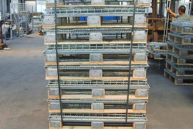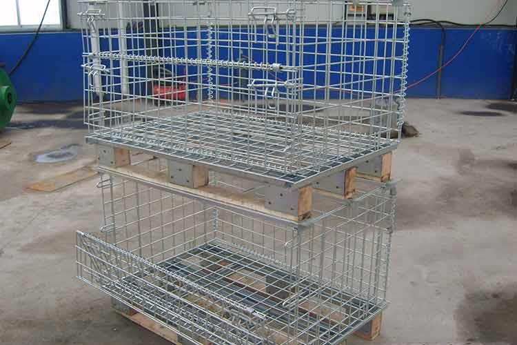 木托仓储笼的主要材料为低碳铁丝、槽钢、热轧钢板等。该仓储笼的外形非常的轻巧,笼体除底框外皆有铁丝碰焊成的网片组合而成,网片与网片、网片与底框靠小连接件连接,可活动。在木托仓储笼空笼时可折叠存放,充分利用空间。同时仓储笼前面可打开,在堆垛后能取物,堆垛时承重在侧面的网片上。